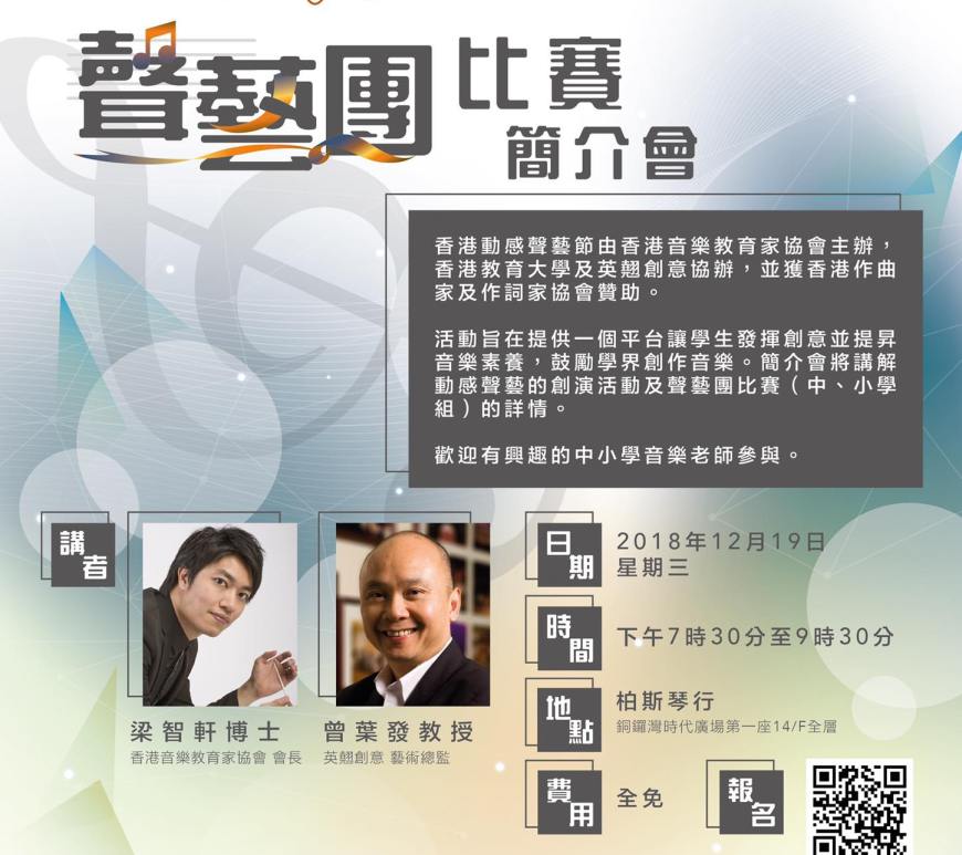 香港動感聲藝節由香港音樂教育家協會主辦,香港教育大學及英翹創意協辦,並獲香港作曲家及作詞家協會贊助。活動旨在提供一個平台讓學生發揮 … 繼續閱讀 2019香港動感聲藝節:聲藝團比賽簡介會